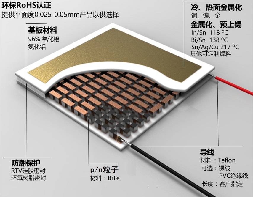 采用独创的材料生产与芯片封装工艺,能有效提高芯片服役寿命、效率以及释放温度循环过程中产生的应力。主要应用于半导体空调、科学仪器、PCR分析仪及其他具有高可靠要求的制冷与恒温场合。