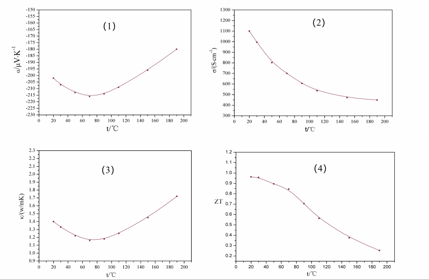 图(1)、(2)、(3)、(4)分别为n型区熔材料的电动势率、电导率、热导率、ZT 值随温度的变化曲线。