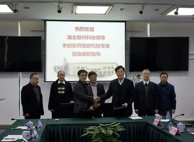 石召华(左三)前往中科院上海药物研究所,与陈凯先院士(右三)签订技术合作协议