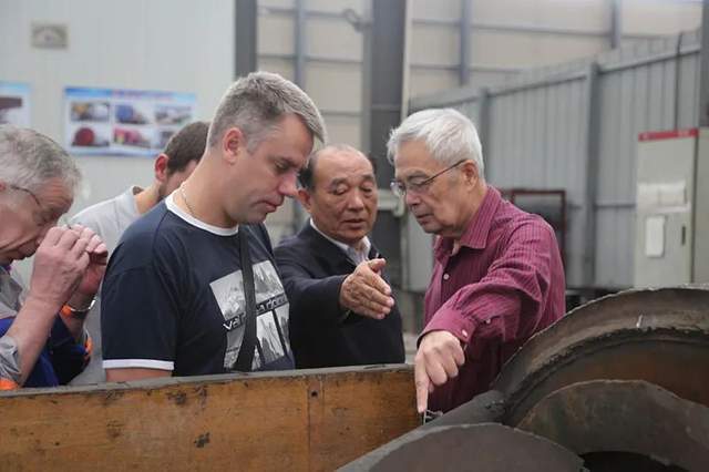 武军总工程师(右二)在公司生产车间向中国工程院院士瞿金平(左三)请教新产品研发技术