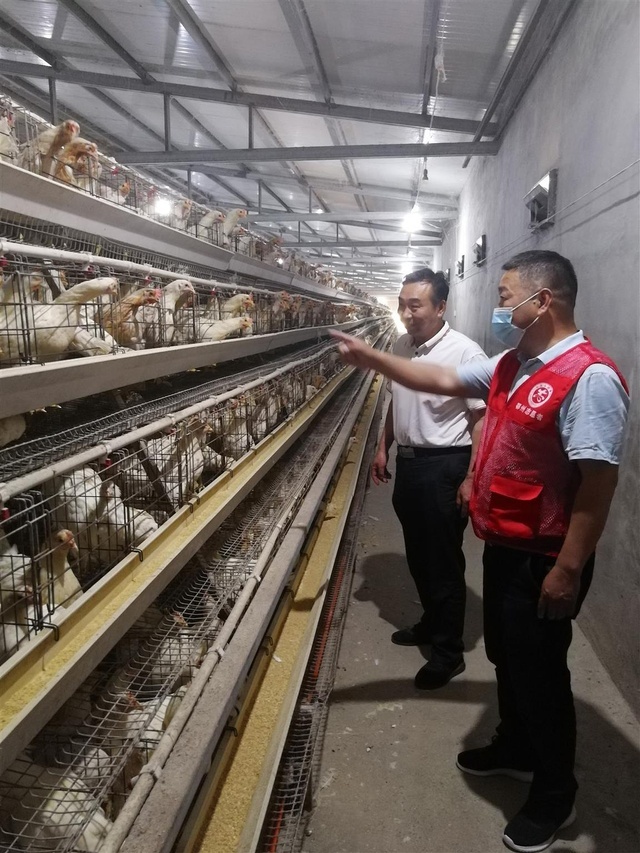 汪兵(右一)在梁子湖区沼山镇种养殖合作社指导养殖户预防鸡病