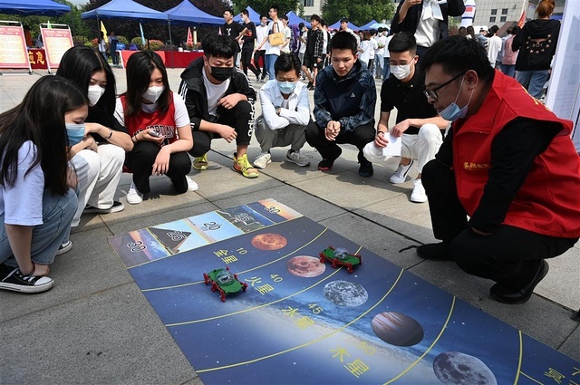 邹志成(右一)在鄂州职业大学向学生展示太空探测机器人