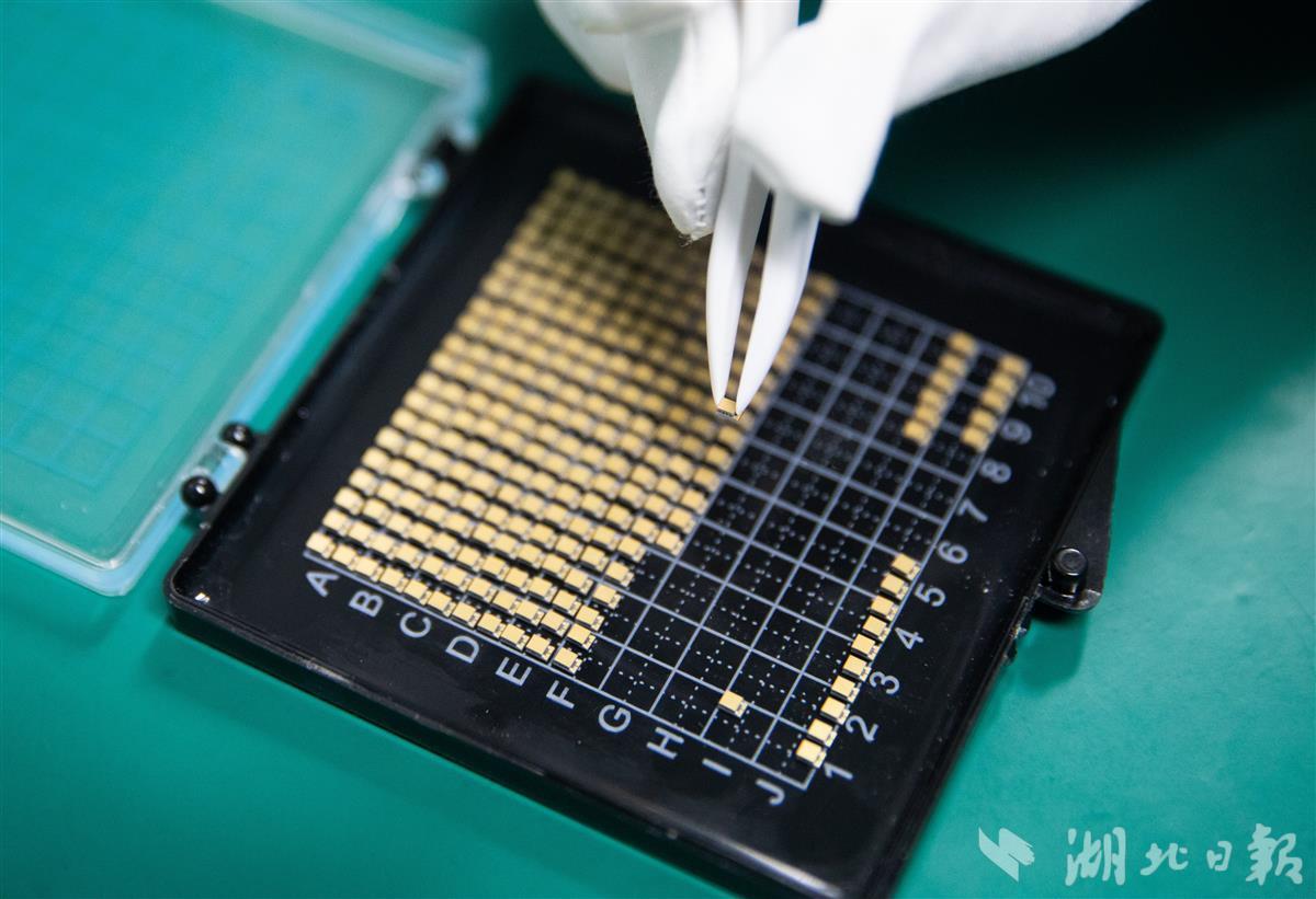 3月8日,湖北赛格瑞新能源科技有限公司,员工展示光模块温控芯片成品。