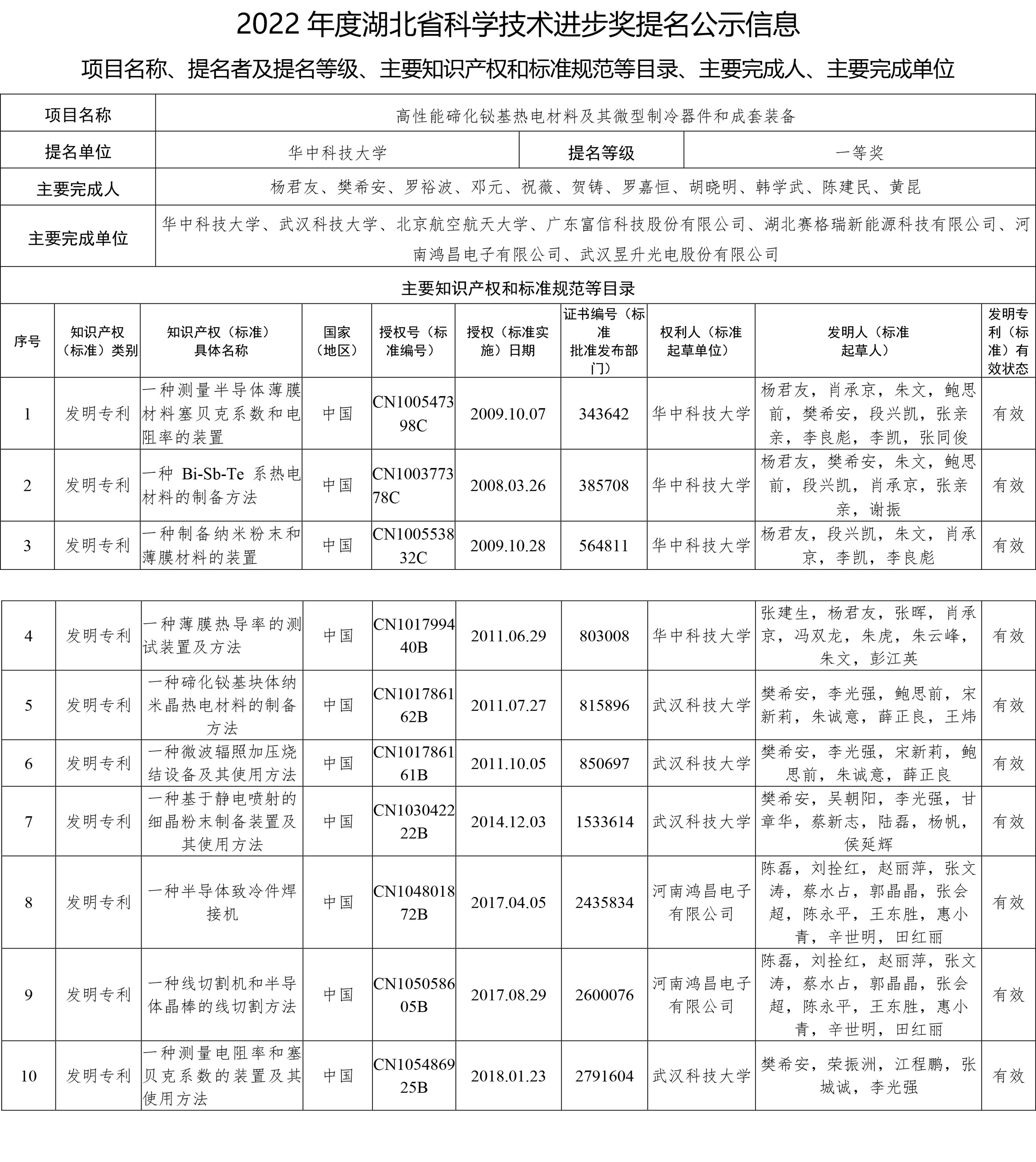 2022年度湖北省科学技术进步奖提名公示信息