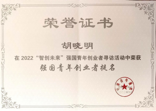 2023年3月1日,由中国青年报社、广东省佛山市人民政府、共青团广东省委员会主办的2022“智创未来”强国青年创业者寻访活动颁奖分享会在佛山市禅城区举行。我公司胡晓明荣获“智创未来“强国青年创业者提名。