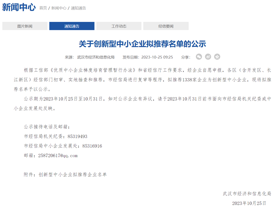 恭喜我司入选武汉市经济和信息化局第三批创新型中小企业拟推荐企业名单。