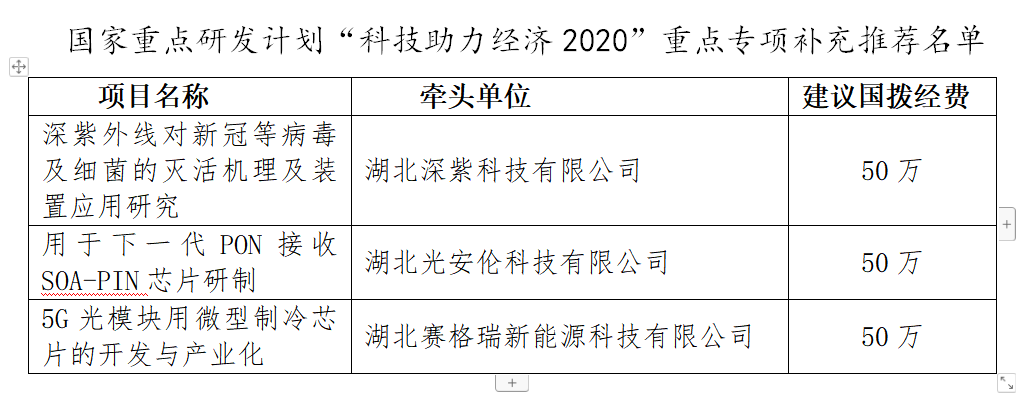 根据省科技厅《关于组织推荐申报“科技助力经济2020”重点专项项目的补充通知》精神,补充推荐的项目必须已在国家科技管理信息系统进行申报,且状态为“已提交组织推荐机构”。市科技局从前期按照《关于组织推荐“科技助力经济2020”重点专项项目的通知》(国科发资〔2020〕81号)和《关于组织推荐申报“科技助力经济2020”重点专项项目的通知》(鄂科技通〔2020〕9号)精神组织申报的未推荐项目中,择优补充推荐“深紫外线对新冠等病毒及细菌的灭活机理及装置应用研究”等3个项目参与省科技厅组织的遴选推荐。项目建议国拨经费均为50万元(根据省科技厅的指导意见,无需考虑系统中申请国拨经费额度,待最终向科技部推荐结果确定后,由省科技厅组织通知企业修改系统中信息)。详细名单见下表。 国家重点研发计划“科技助力经济2020”重点专项补充推荐名单