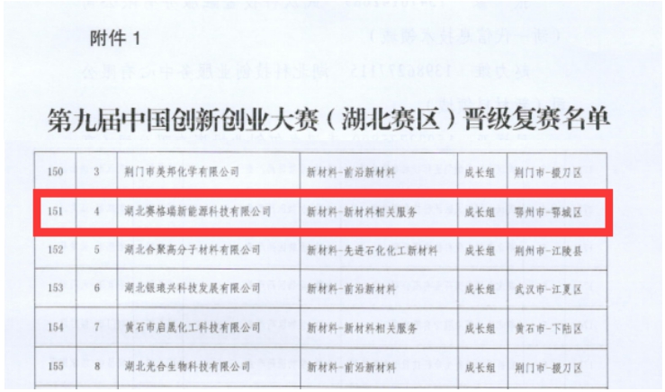 新材料领域共22个项目进入复赛,湖北赛格瑞新能源科技有限公司成功进入该领域复赛。