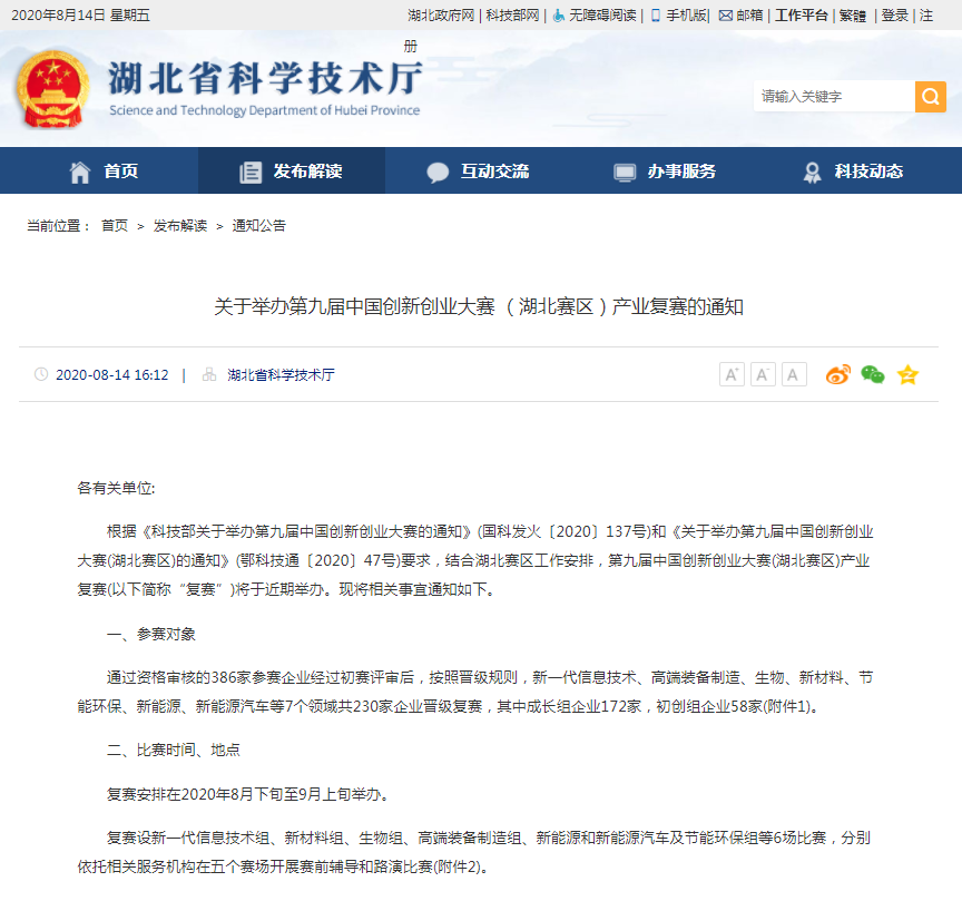 第九届中国创新创业大赛(湖北赛区)于2020年7月底开展,经过初赛评审后,通过资格审核一共有386家参赛企业,按照晋级规则,新一代信息技术、高端装备制造、生物、新材料、节能环保、新能源、新能源汽车等7个领域共230家企业晋级复赛,其中成长组企业172家,初创组企业58家。